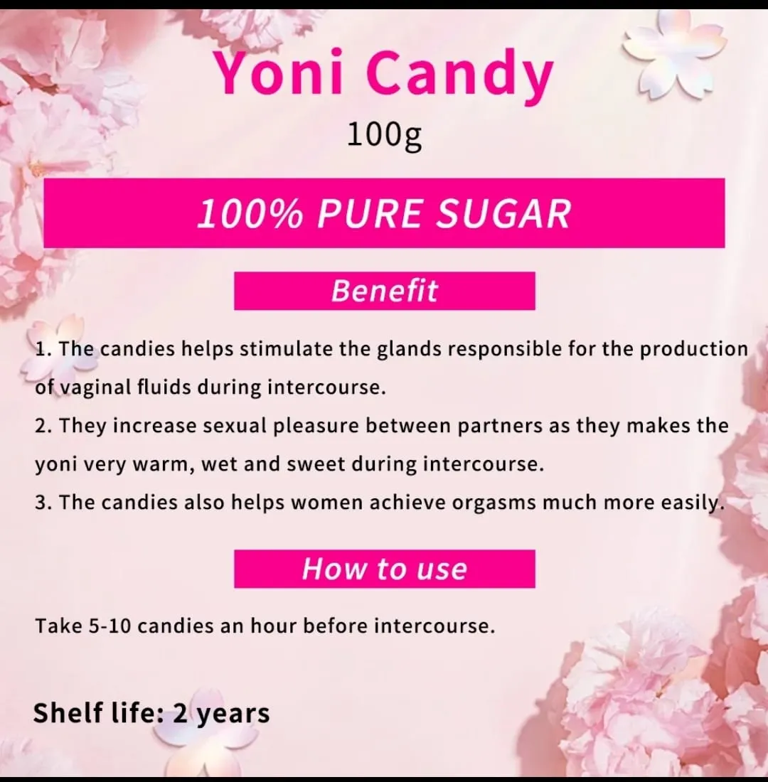 Experience a new level of intimacy with Yoni Candy, a unique product designed to enhance sexual pleasure and comfort. These specially formulated candies stimulate the glands responsible for the production of vaginal fluids, helping to increase natural lubrication during intercourse.